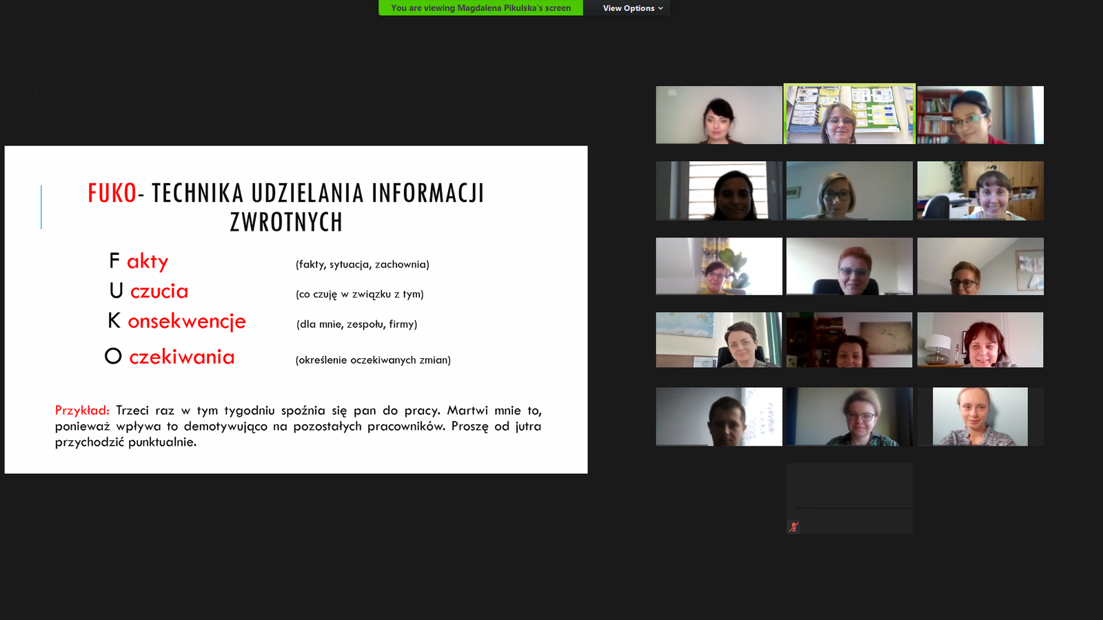 Jako pierwsze odbyły się szkolenia realizowane przez Panią Magdalenę Pikulską z Centrum Szkoleń i Rekrutacji nt. „Techniki Radzenia sobie z agresją studenta oraz z własnymi emocjami w trudnych sytuacjach w administracji uczelnianej”. Pierwsza edycja zrealizowana została w dniu 4 listopada, a druga w dniu 5 listopada 2020 r. W obu edycjach wzięło udział 30 pracowników z różnych jednostek organizacyjnych PRz i różnych grup pracowniczych.